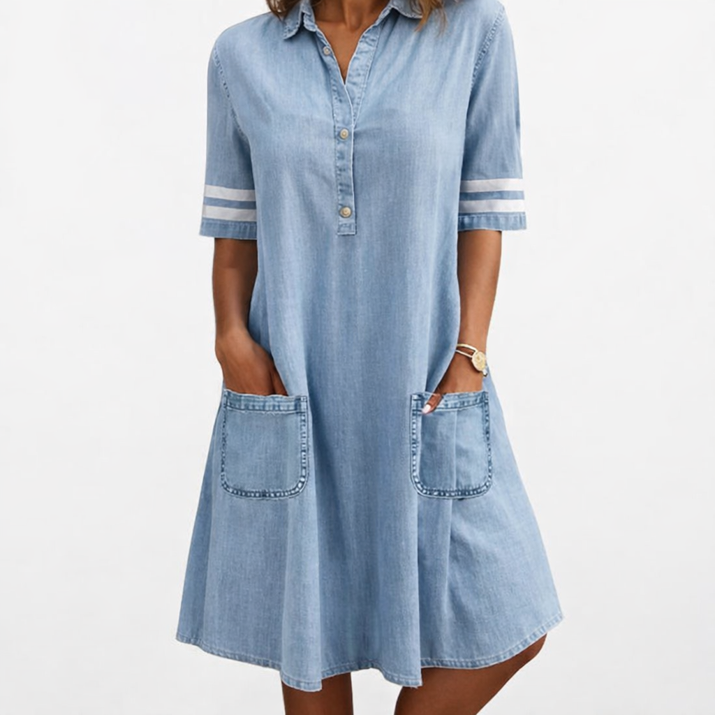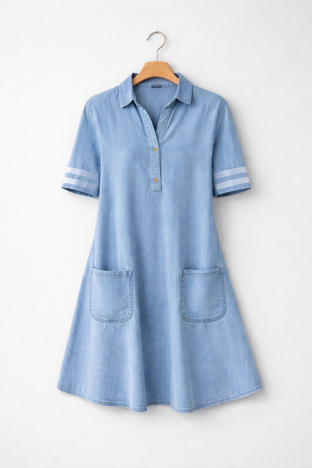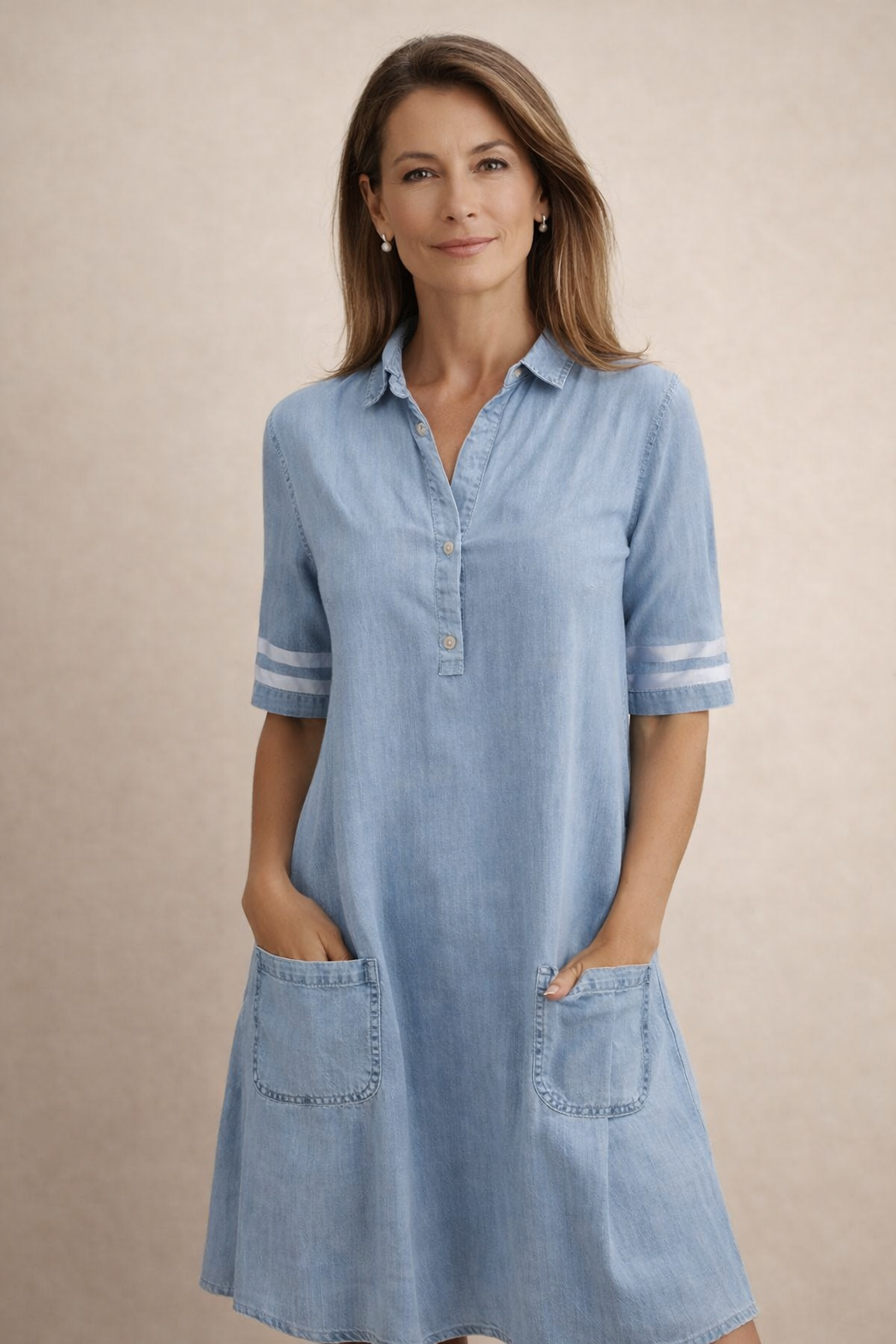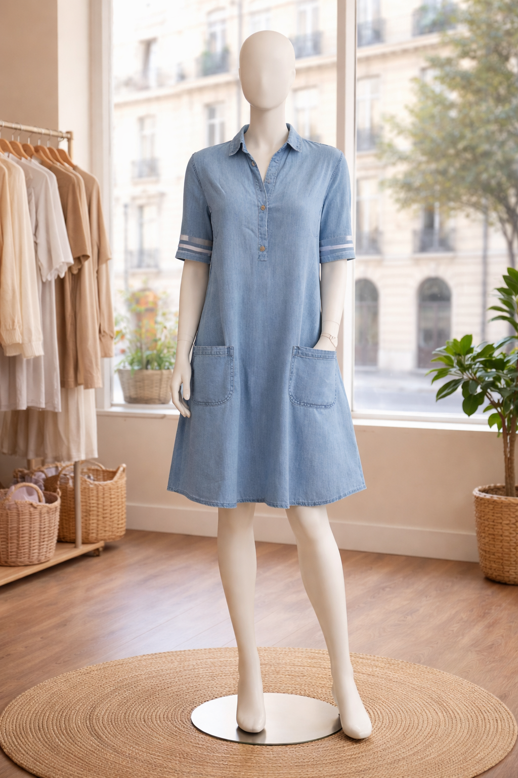 Die perfekte Kombination aus Komfort und müheloser Eleganz. Dieses Jeanskleid wurde entworfen, um Ihre Silhouette sanft zu betonen und Ihnen gleichzeitig maximale Bewegungsfreiheit zu bieten.